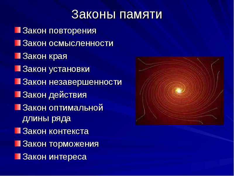 - 18. Законы памяти Закон повторения Закон осмысленности Закон края Закон установки Закон