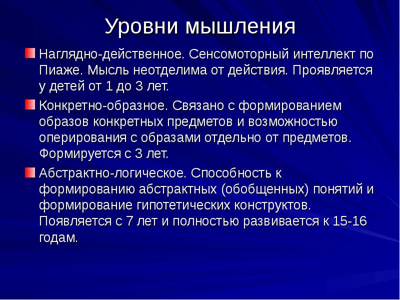 - 21. Уровни мышления Наглядно-действенное. Сенсомоторный интеллект по Пиаже. Мысль неотделима от действия.