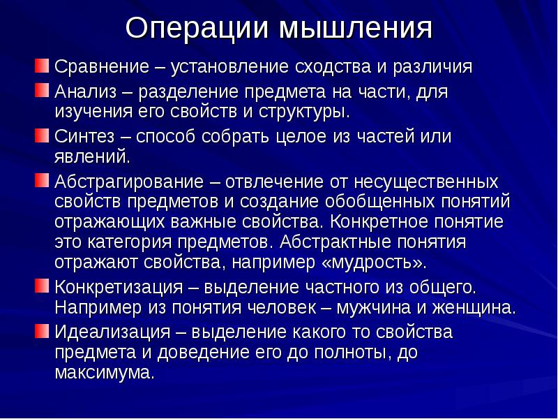 - 22. Операции мышления Сравнение – установление сходства и различия Анализ – разделение