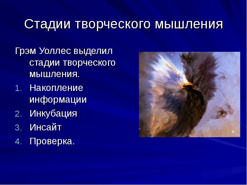 - 24. Стадии творческого мышления Грэм Уоллес выделил стадии творческого мышления. Накопление информации