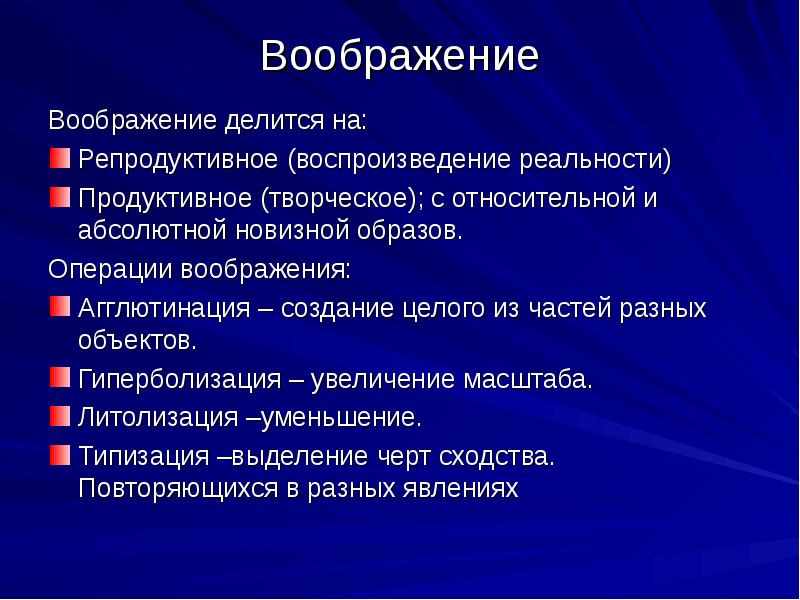 - 28. Воображение Воображение делится на: Репродуктивное (воспроизведение реальности) Продуктивное (творческое); с относительной