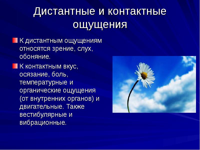 - 10. Дистантные и контактные ощущения К дистантным ощущениям относятся зрение, слух, обоняние.
