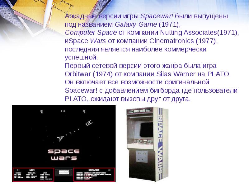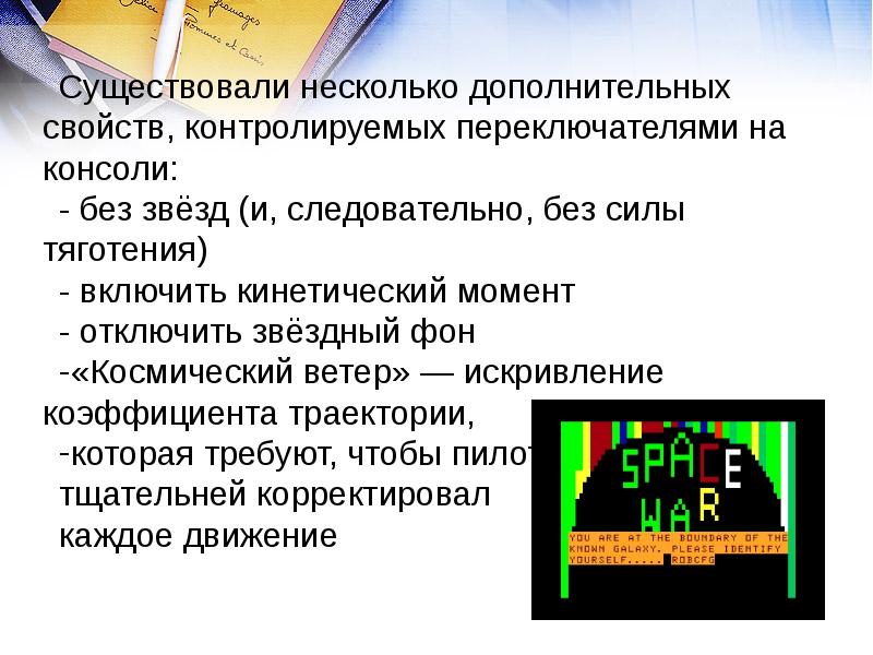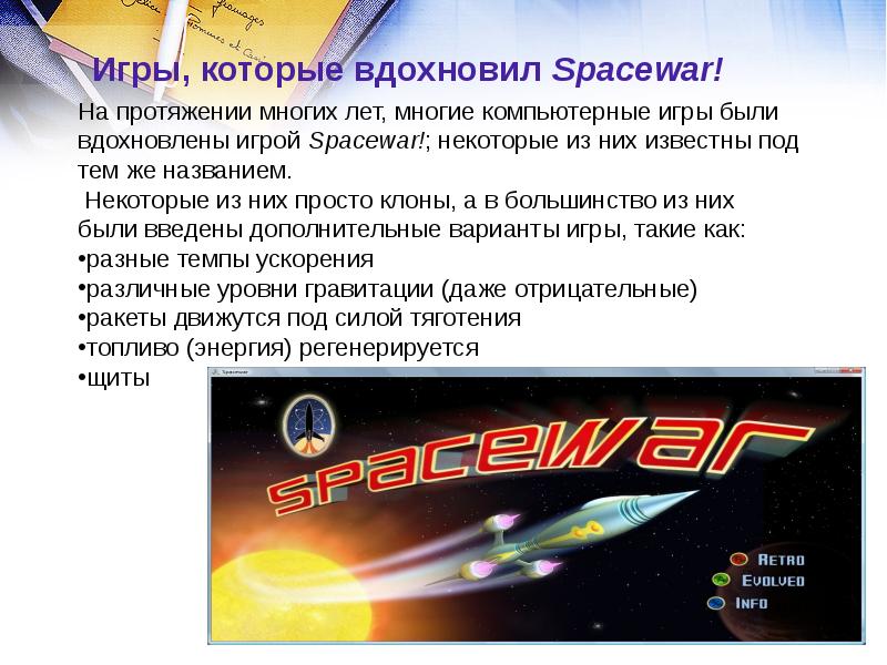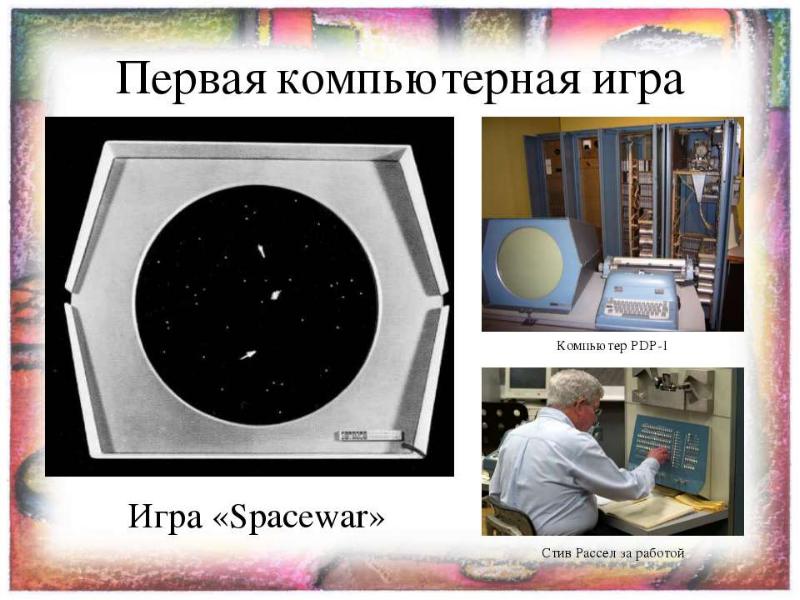 - 3. В 1962 году Стив Рассел (англ.)русск. разработал игру «Spacewar!» (Космическая война