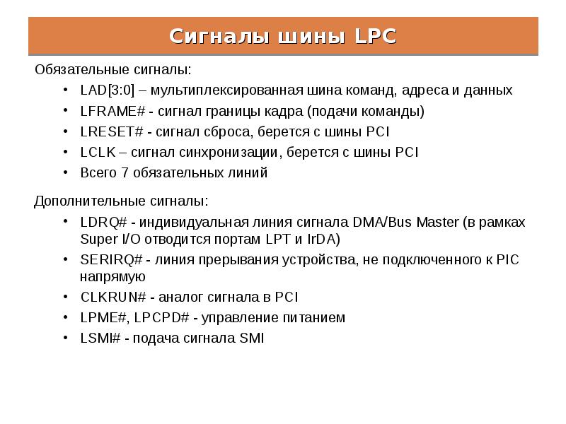 - 2. Шина LPC LPC (Low Pin Count) – специализированная системная периферийная шина,