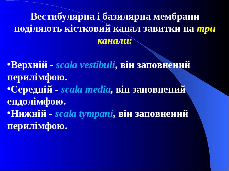 - 12. Ендо- и перилімфа внутрішнього вуха Простір середніх сходів заповнений ендолімфою. Простір