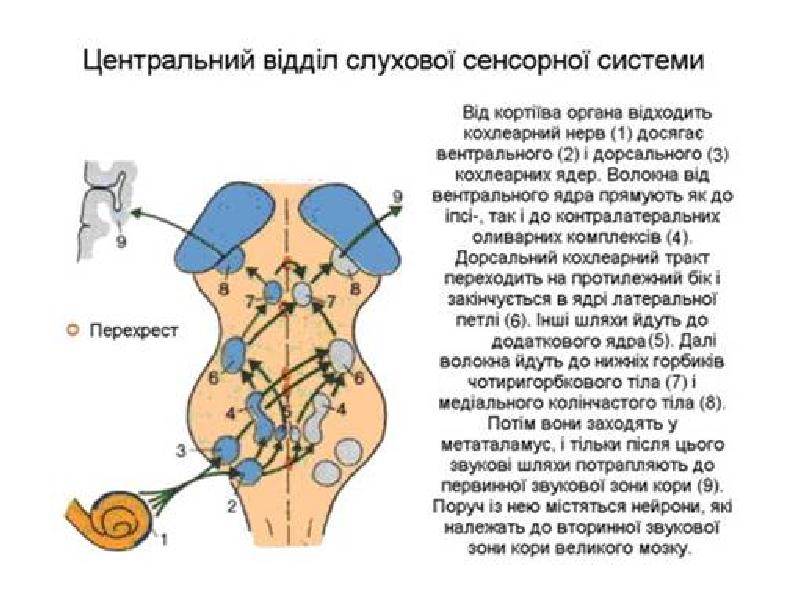 - 21. Обробка звукової інформації в ЦНС Дорсальний кохлеарний тракт переходить на