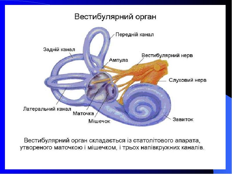 - 27. Вестибулярний орган складається з: Статолітового апарату Півколових каналів Маточки і мішечка