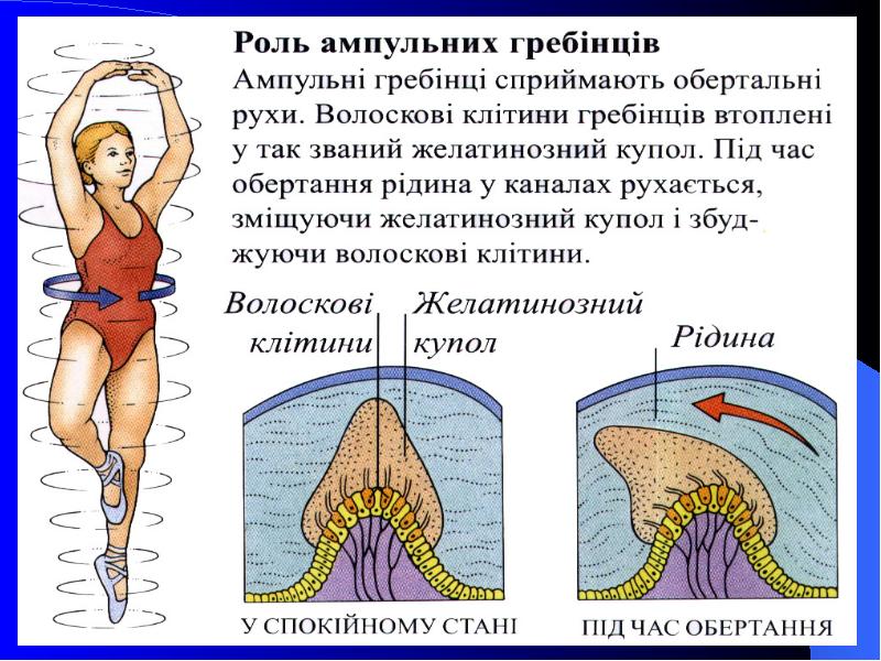 - 31. Маточка і мішечок Рецептори маточки і мішечка контролюють прямолінійні рухи людини.