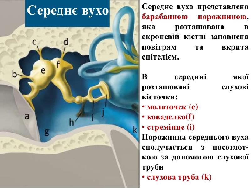 - 6. Среднє вухо Слухові кісточки: молоточок, коваделко і стремінце передають і підсилюють