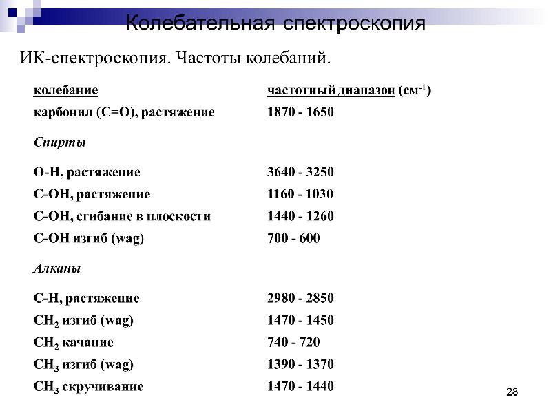- 72. ИК-спектроскопия Совпадение частоты сравниваемой полосы с табличным интервалом частот