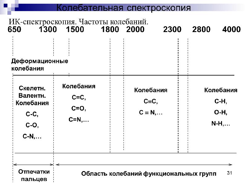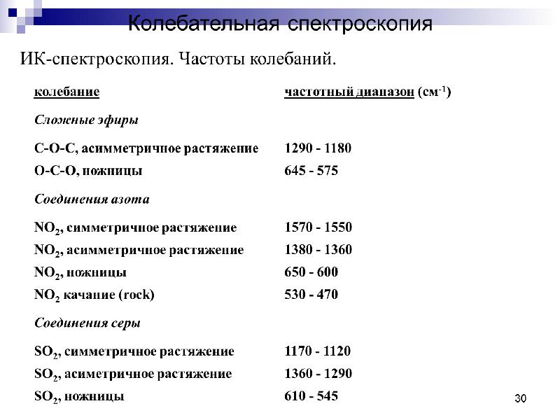 - 30. УФ-спектроскопия Характеристикой электронных спектров поглощения в УФ- и видимой