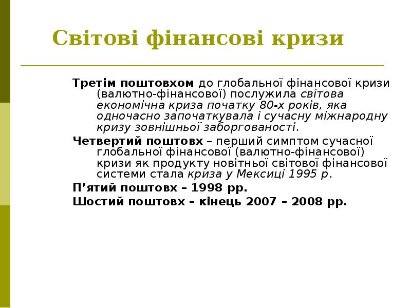 - 63. 7. Світові фінансові кризи: сутність, передумови виникнення та наслідки для розвитку