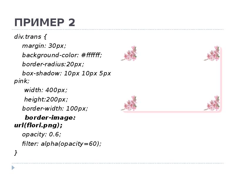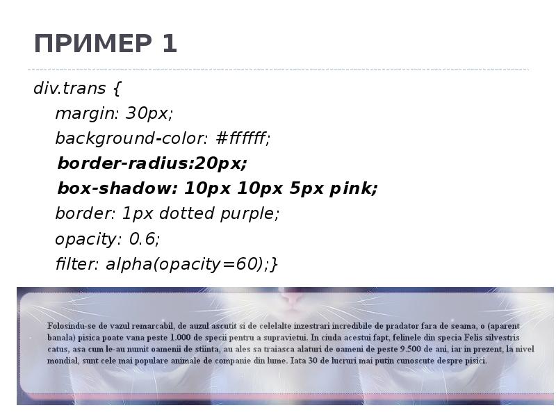 - 13. ПРИМЕР 2 div.trans { margin: 30px; background-color: #ffffff;