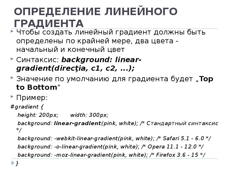 - 20. ОПРЕДЕЛЕНИЕ ЛИНЕЙНОГО ГРАДИЕНТА Чтобы создать линейный градиент должны быть определены по