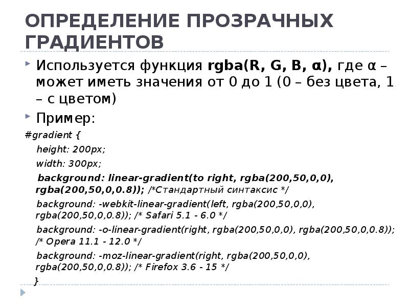 - 25. ОПРЕДЕЛЕНИЕ ПРОЗРАЧНЫХ ГРАДИЕНТОВ Используется функция rgba(R, G, B, α), где α