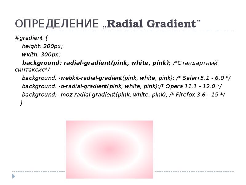 - 27. ОПРЕДЕЛЕНИЕ „Radial Gradient” #gradient { height: 200px; width: 300px;