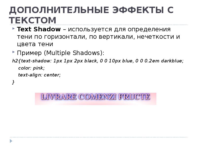 - 28. ДОПОЛНИТЕЛЬНЫЕ ЭФФЕКТЫ С ТЕКСТОМ Text Shadow – используется для определения тени