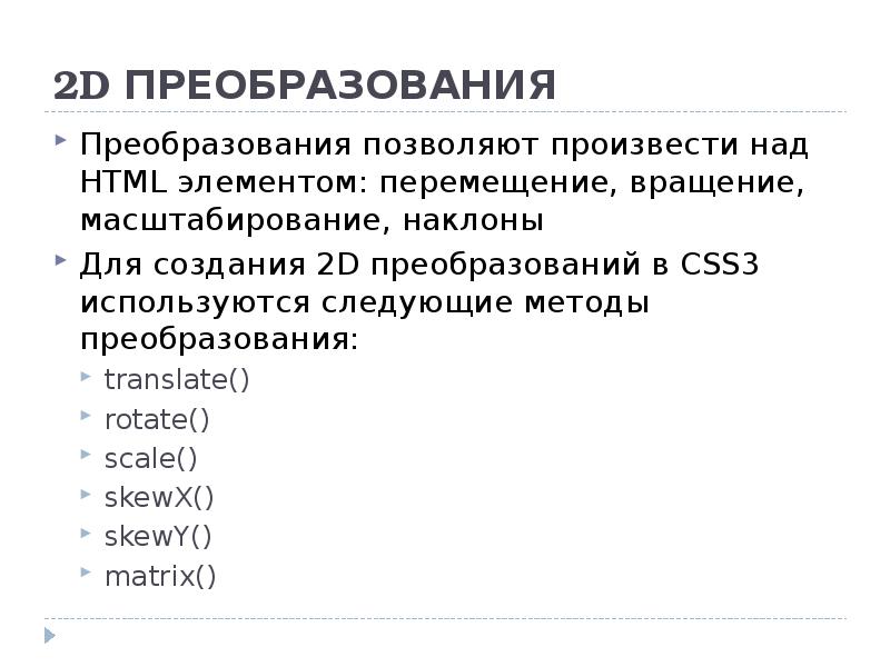 - 29. 2D ПРЕОБРАЗОВАНИЯ Преобразования позволяют произвести над HTML элементом: перемещение, вращение, масштабирование,
