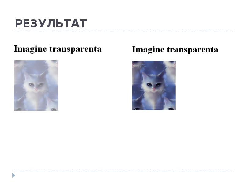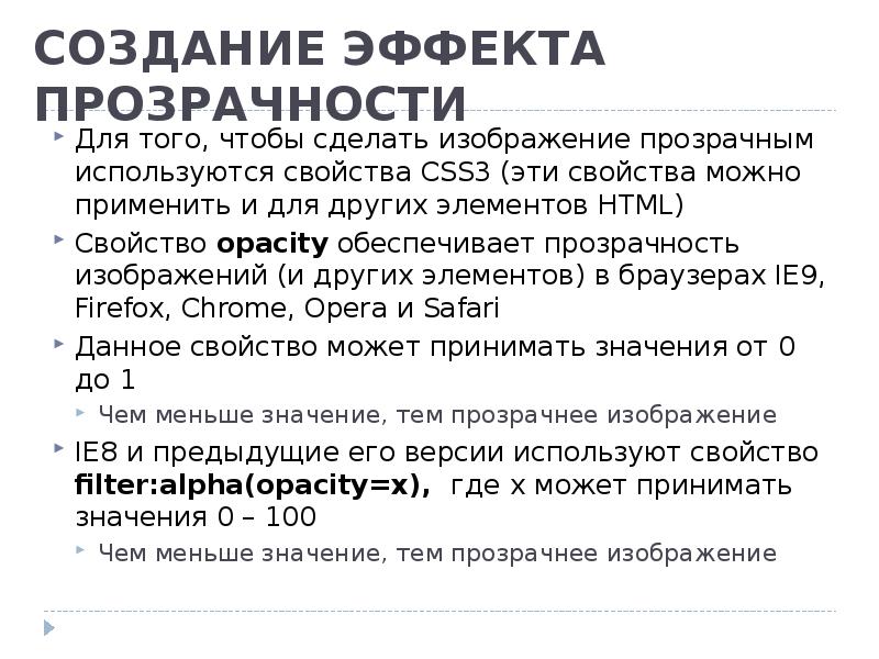 - 4. СОЗДАНИЕ ЭФФЕКТА ПРОЗРАЧНОСТИ Для того, чтобы сделать изображение прозрачным используются свойства