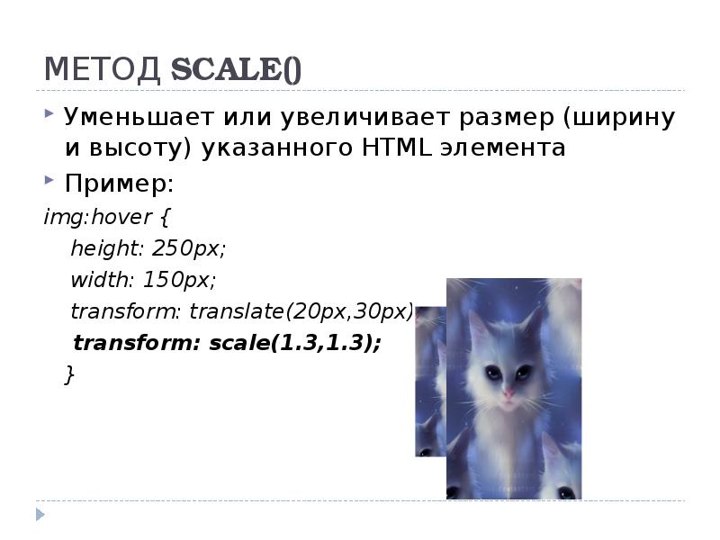 - 32. МЕТОД SCALE() Уменьшает или увеличивает размер (ширину и высоту) указанного HTML