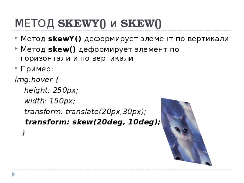 - 33. МЕТОД SKEWX() Деформирует элемент по горизонтали (по x) Пример: img:hover {