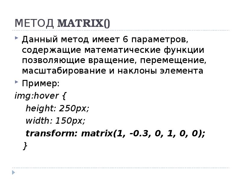 - 35. МЕТОД MATRIX() Данный метод имеет 6 параметров, содержащие математические функции позволяющие