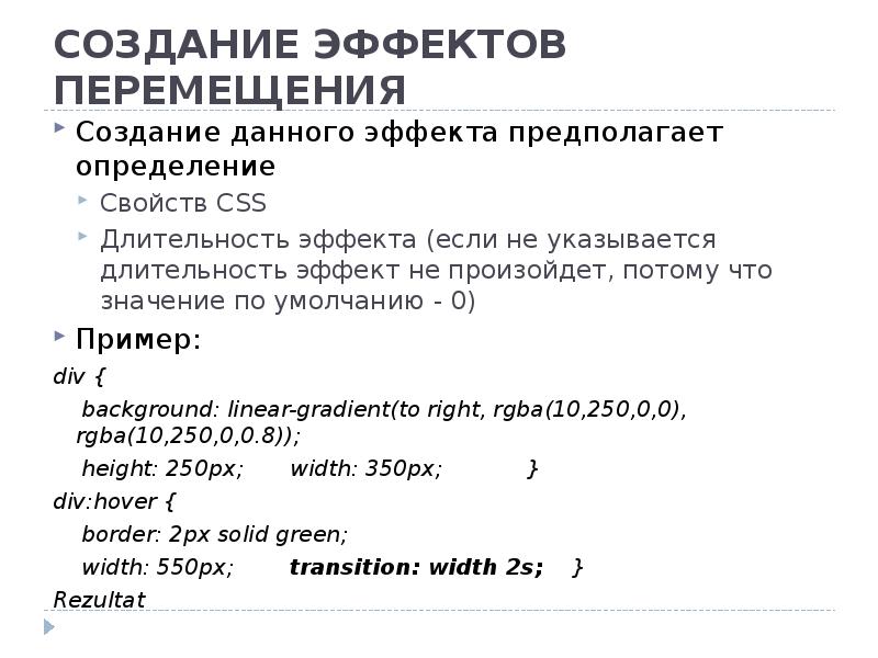 - 36. СОЗДАНИЕ ЭФФЕКТОВ ПЕРЕМЕЩЕНИЯ Создание данного эффекта предполагает определение Свойств CSS Длительность