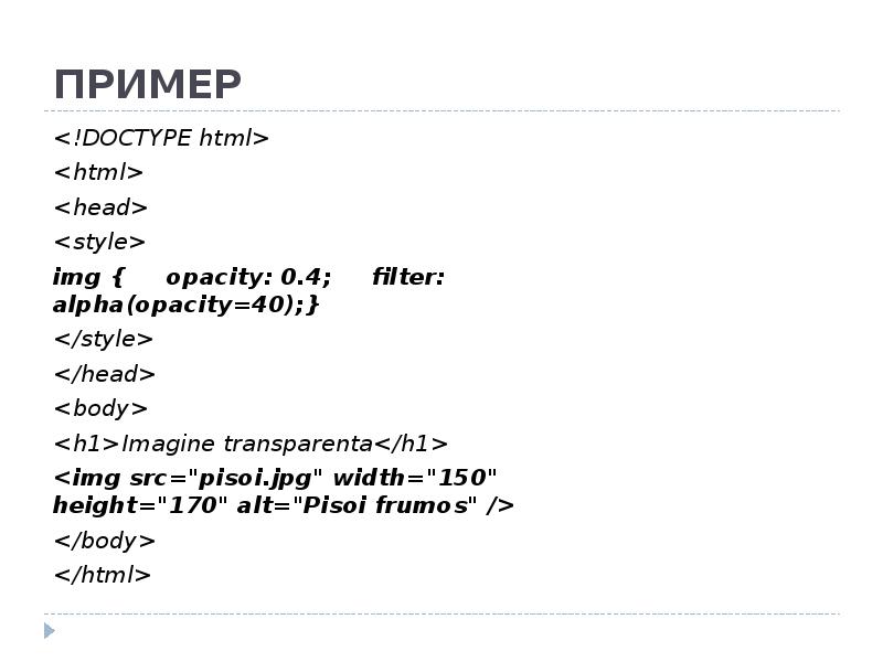 - 5. ПРИМЕР <!DOCTYPE html> <html> <head> <style> img { opacity: 0.4;