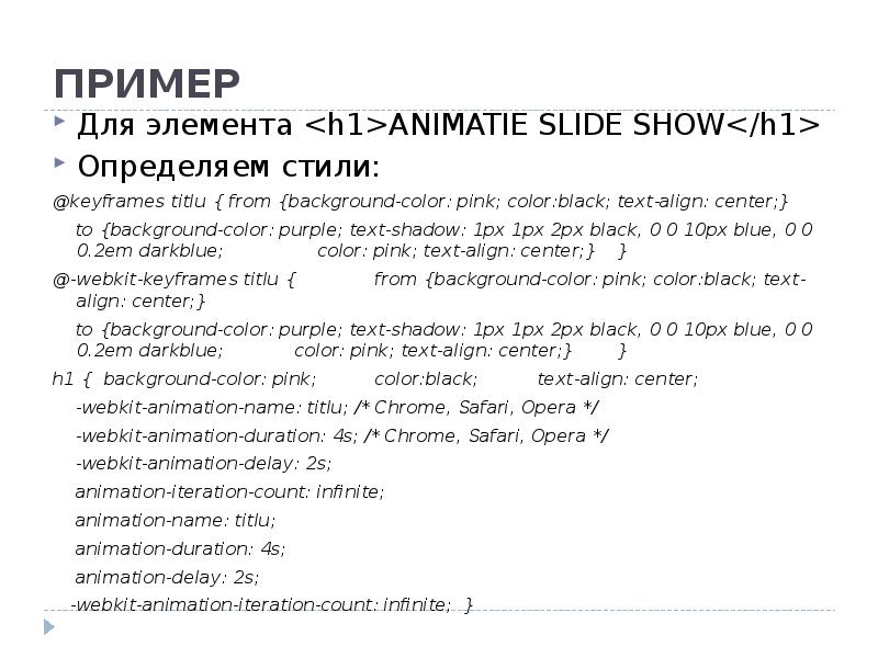 - 41. ПРИМЕР Для элемента <h1>ANIMATIE SLIDE SHOW</h1> Определяем стили: @keyframes titlu {