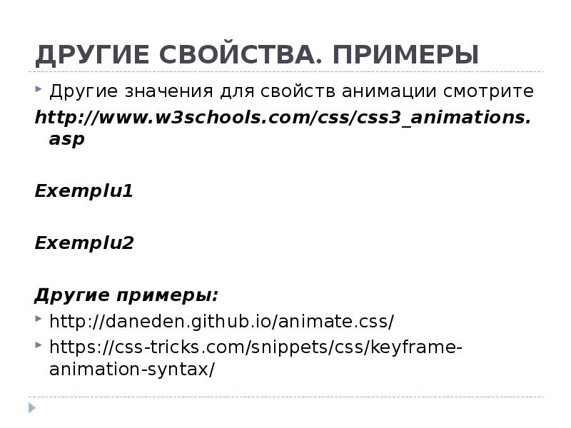 - 42. ДРУГИЕ СВОЙСТВА. ПРИМЕРЫ Другие значения для свойств анимации смотрите http://www.w3schools.com/css/css3_animations.asp