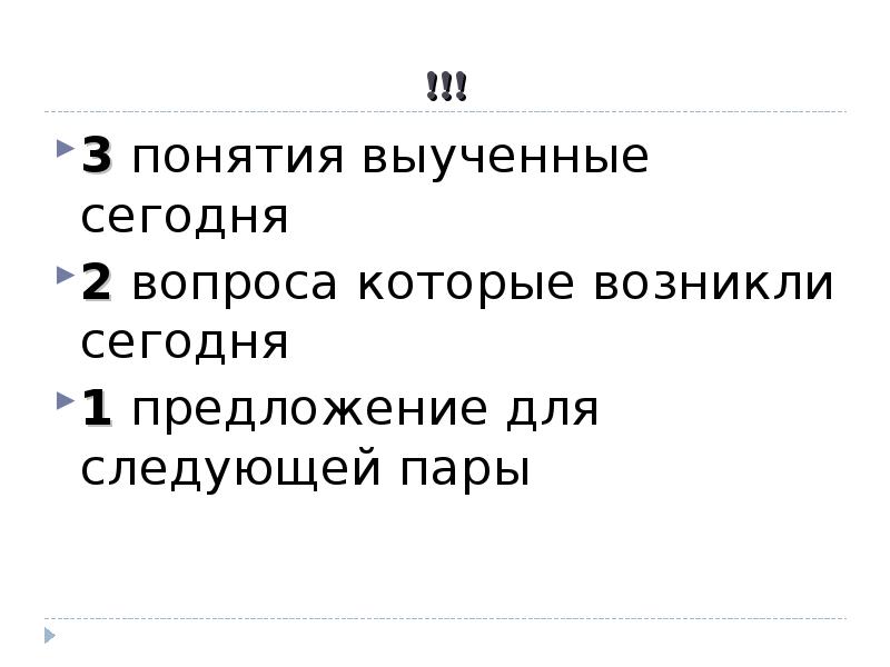 - 43. !!! 3 понятия выученные сегодня 2 вопроса которые возникли сегодня 1