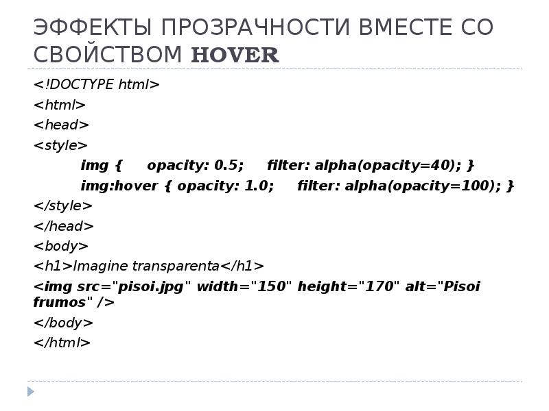 - 6. ЭФФЕКТЫ ПРОЗРАЧНОСТИ ВМЕСТЕ СО СВОЙСТВОМ HOVER <!DOCTYPE html> <html> <head> <style>