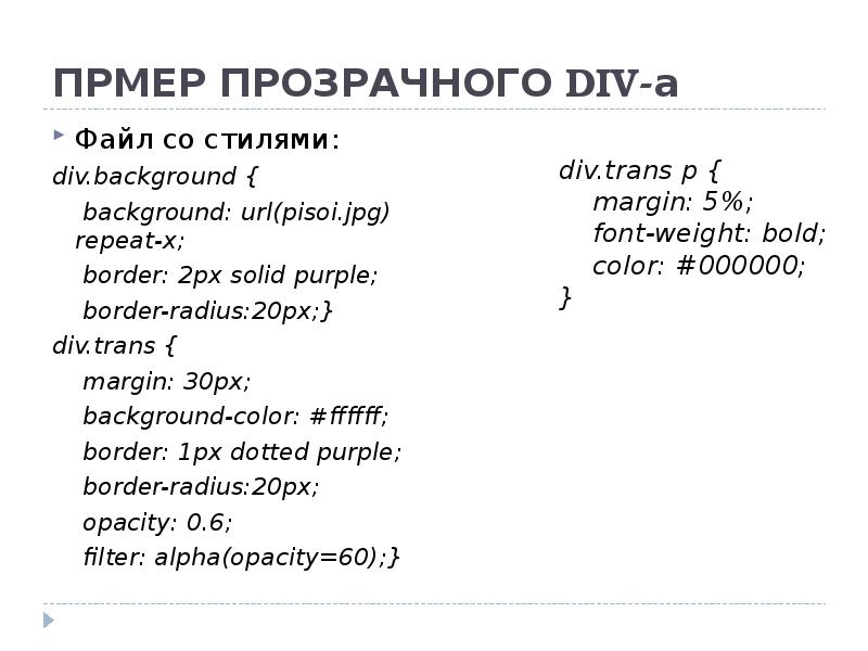 - 12. ПРИМЕР 1 div.trans { margin: 30px; background-color: #ffffff;