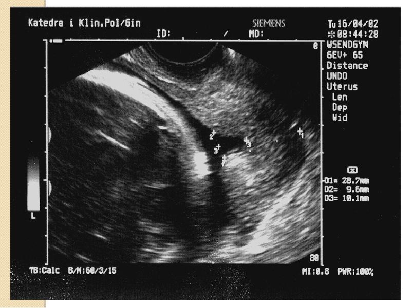 - 23. Poronienie zatrzymane (missed abortion) Brak wydalenia obumarłego płodu w przewidzianym czasie