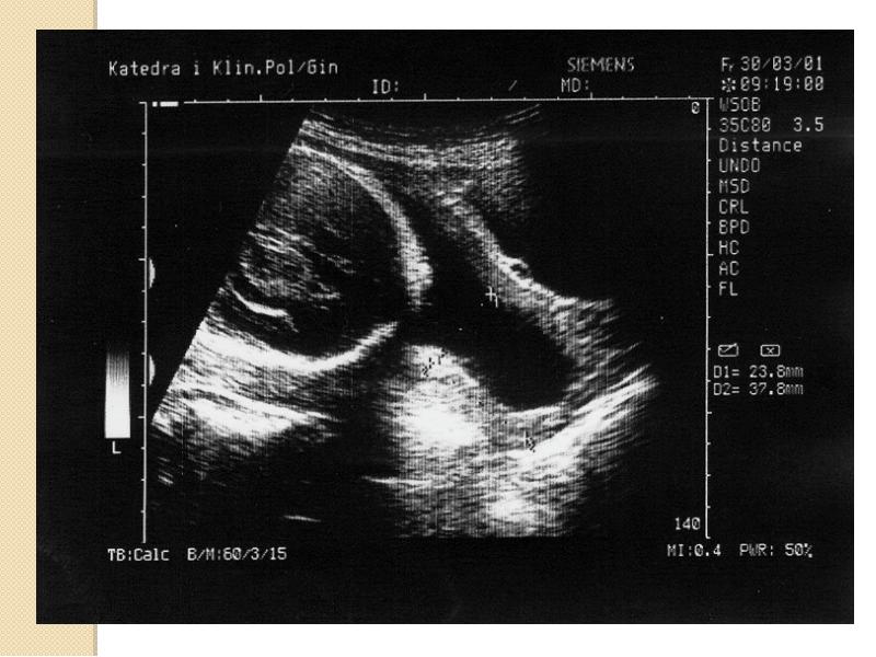 - 45. Niewydolność cieśniowo-szyjkowa Badanie USG Średnia długość szyjki macicy 38-42mm Długość