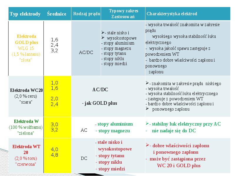 - 113. TIG 141 Rodzaj i średnica elektrody nietopliwej - podstawowym materiałem elektrod