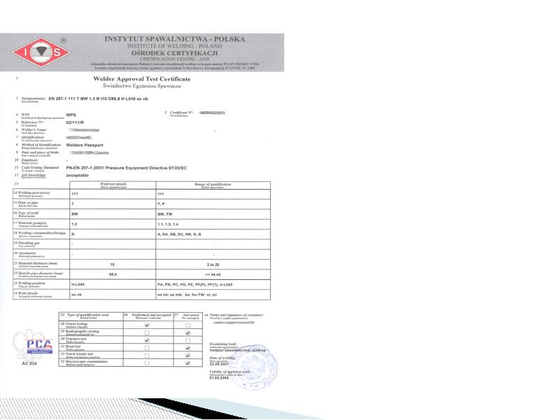 - 61. Oznaczenia egzaminu spawacza wg . PN-EN 287 lub PN-EN ISO