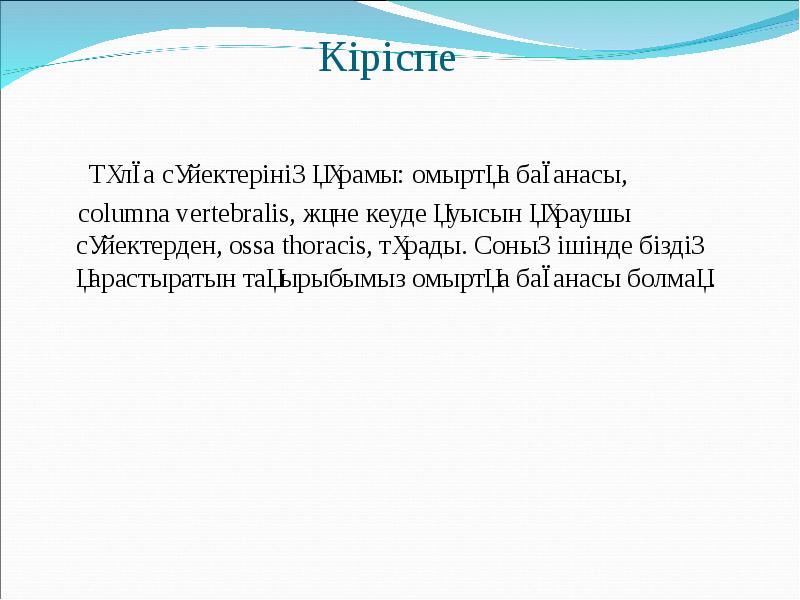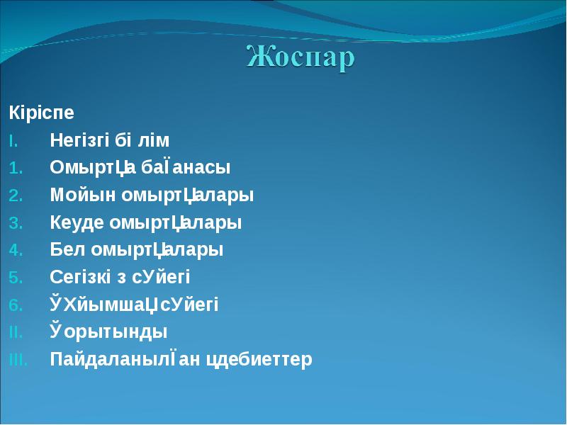 - 2. Кіріспе Негізгі бөлім Омыртқа бағанасы Мойын омыртқалары Кеуде омыртқалары Бел омыртқалары