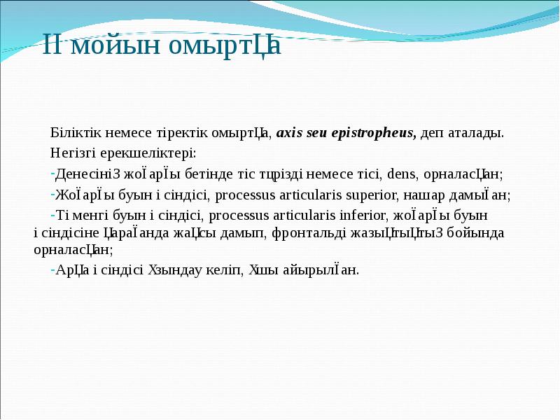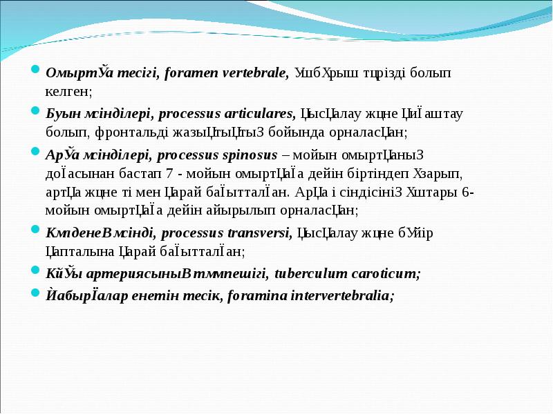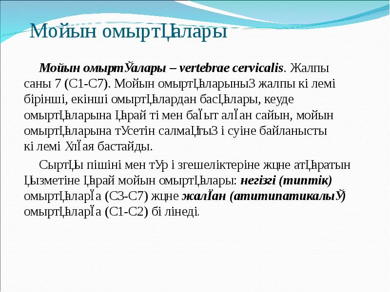 - 10. Мойын омыртқалары Мойын омыртқалары – vertebrae cervicalis. Жалпы саны 7 (С1-С7).