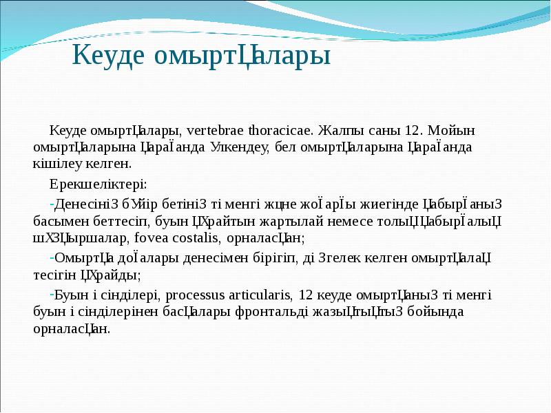 - 19. Кеуде омыртқалары Кеуде омыртқалары, vertebrae thoracicae. Жалпы саны 12. Мойын омыртқаларына