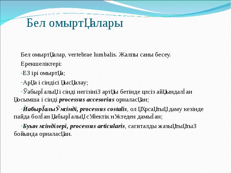 - 22. Бел омыртқалары Бел омыртқалар, vertebrae lumbalis. Жалпы саны бесеу. Ерекшеліктері: Ең