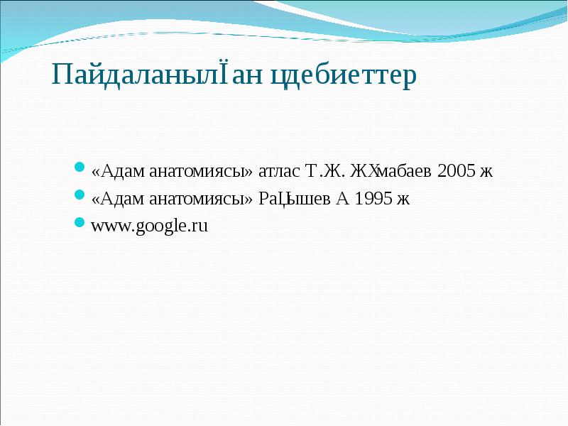 - 33. Пайдаланылған әдебиеттер «Адам анатомиясы» атлас Ү.Ж. Жұмабаев 2005 ж «Адам анатомиясы»