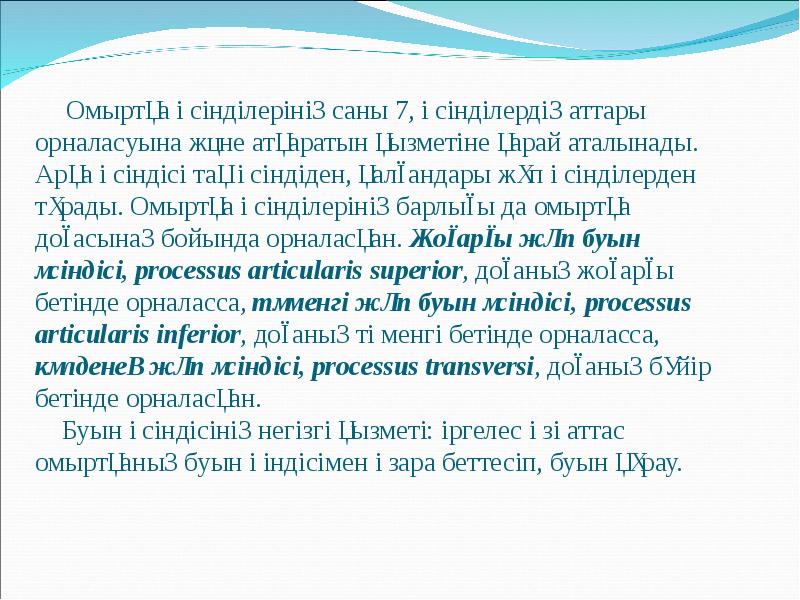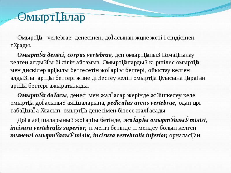 - 7. Омыртқалар Омыртқа, vertebrae: денесінен, доғасынан және жеті өсіндісінен тұрады. Омыртқа денесі,
