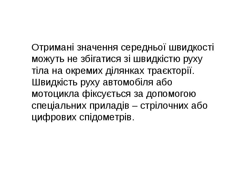 пункт свого призначення. Тому часто нехтують змінами швидкості руху, а враховують лише пройдений шлях і час, який потрібний для подолання цього шляху. Розраховану в такому разі швидкість називають середньою.
