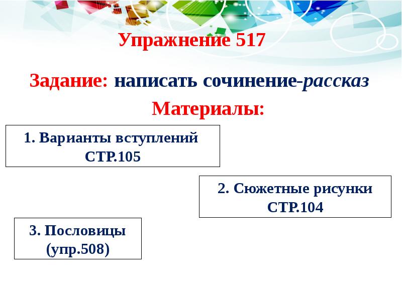 - 13. Задание: Написать сочинение-рассказ по сюжетным рисункам (в упр.517), выбрав одно из