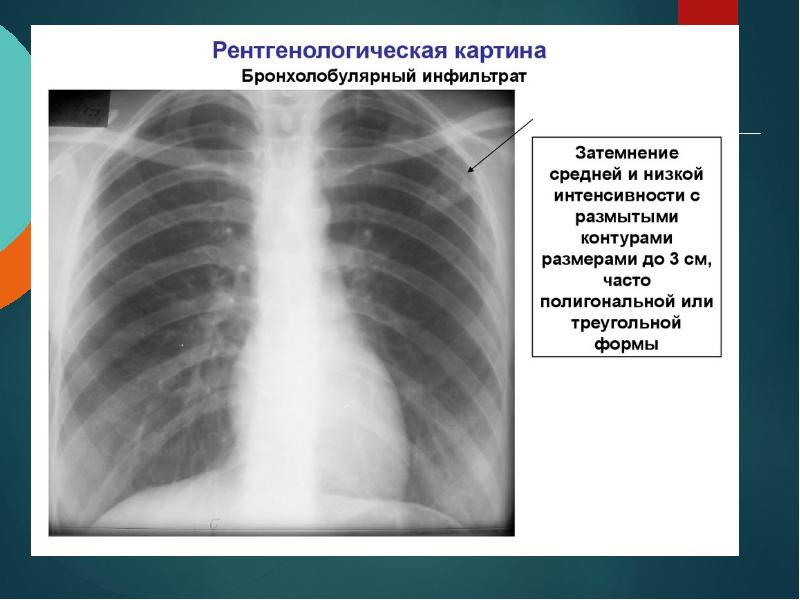 - 10. Бронхолобулярный Инфильтратный туберкулезлегких рентгенологическая картина Бронхолобулярный инфильтрат диаметром 1,5—2 см, округлой