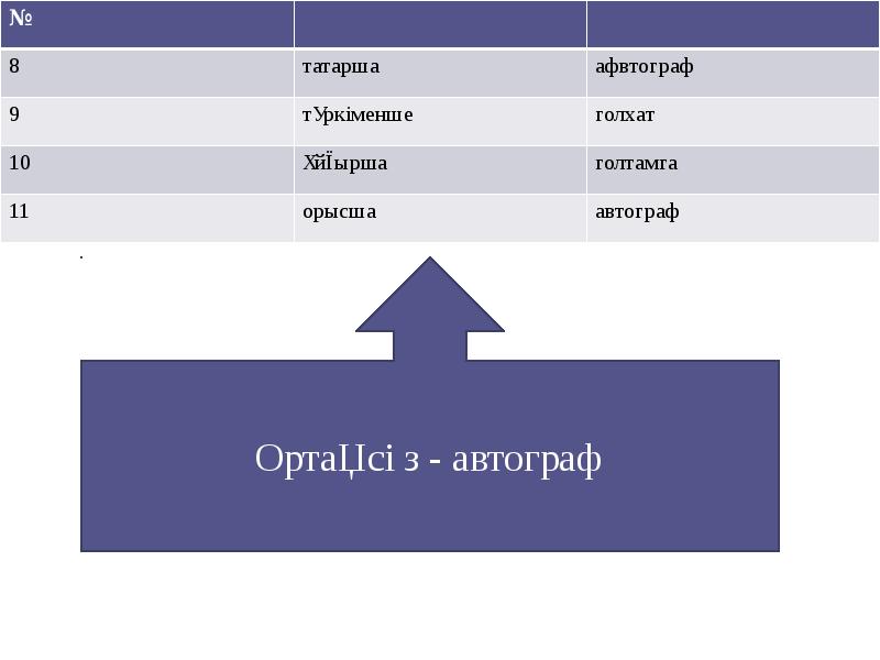 - 6. Салыстырмалы түрде: Қазақша “қолтаңба” сөзі басқа түркі тілдерінде: