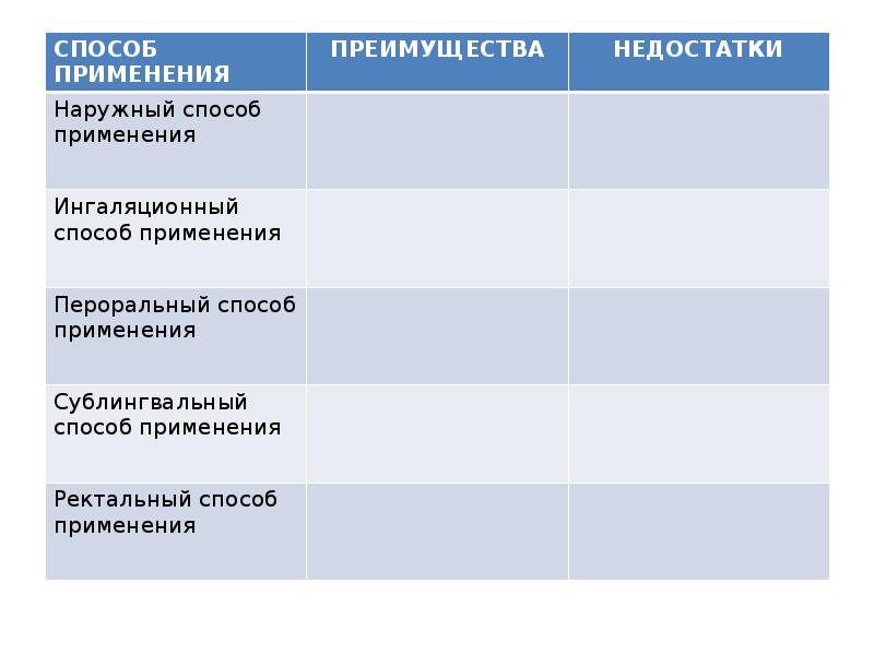 - 2. ЗАДАНИЕ Составьте сравнительную таблицу преимуществ и недостатков различных способов применения лекарственных