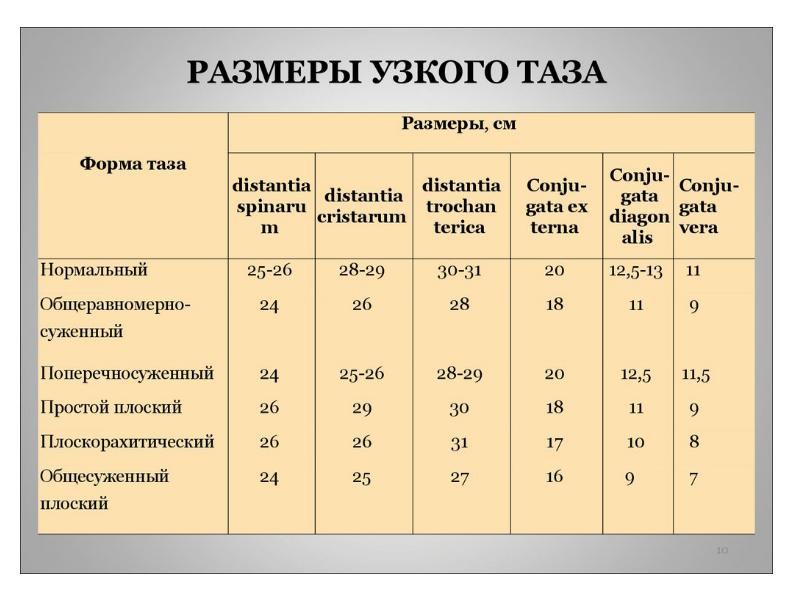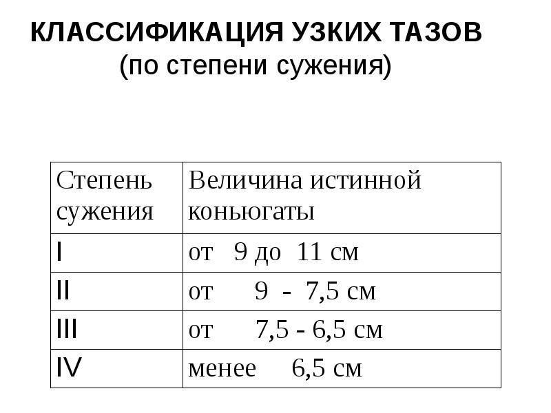 - 10. Основным показателем сужения таза принято считать размер истинной конъюгаты – если