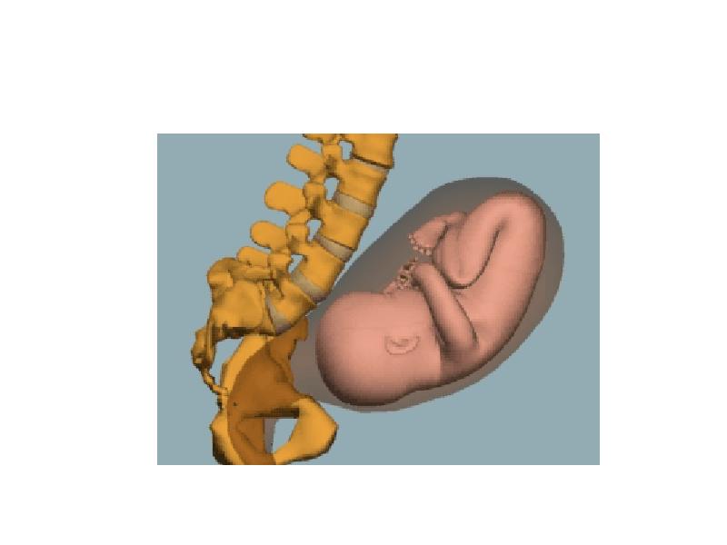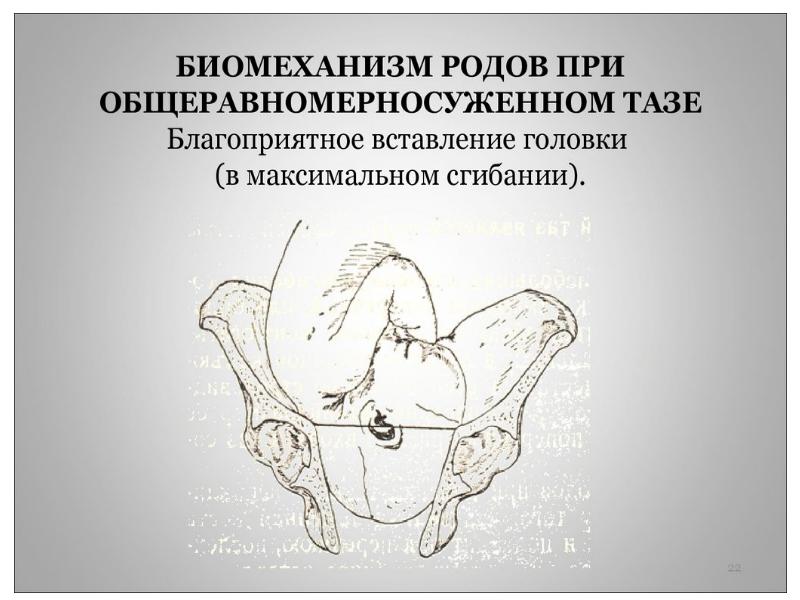 - 30. Биомеханизм родов Форма анатомического сужения таза определяет механизм предлежания, вставления и
